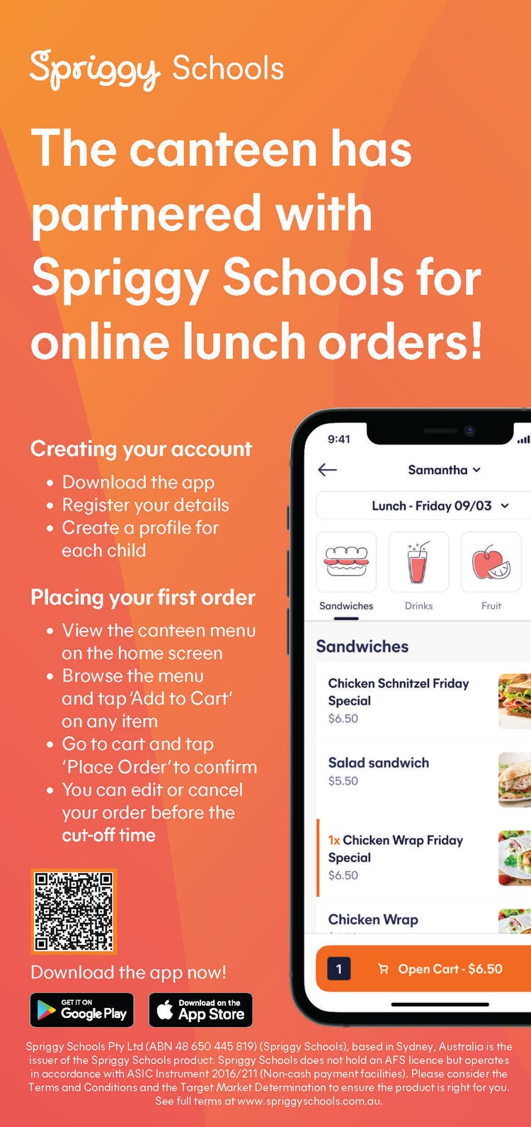The P&C uses Spriggy Schools for our online ordering platform. It's easy to create an account and place an order. There is a separate collection line for online orders, making it faster and easier to collect food. Order cut off is 8:00am.